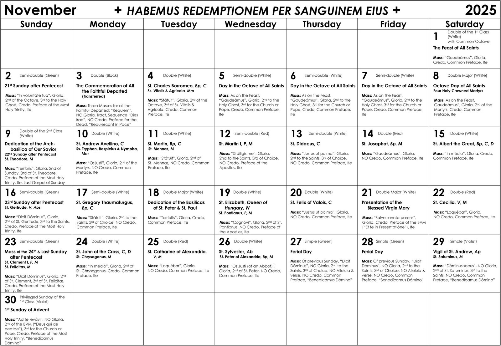 The November calendar has been posted. We encourage you to notice and appreciate the richness of the meaningful liturgy of the pre-1955 liturgical celebrations, its clarity and encompassing way of presenting –through the hands of the priest– our prayers to the Lord, in unity with all the traditional intentions and orations the Holy Mother Church instructs us to recall in all Masses of the month. The pre-Bugnini liturgy is, without doubt, the best and most coherent way of defending our traditional Catholic faith in the present time.