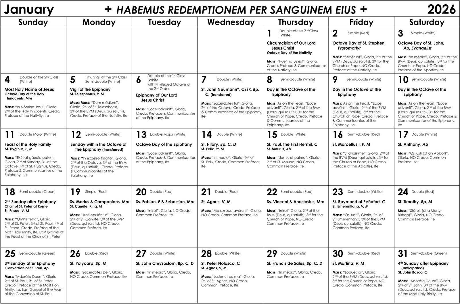 The January calendar has been reposted. The calendar graphic has been updated to account for two Sunday liturgies that are celebrated on weekdays this year. The first one – Sunday in the Octave of Epiphany – is commemorated on Sunday, January 11, the Feast of the Holy Family, but the full Mass is celebrated a day later, on Monday, Jan. 12. The second Sunday liturgy – the 4th Sunday after Epiphany – is anticipated on Saturday, January 31, the day before Septuagesima season begins.